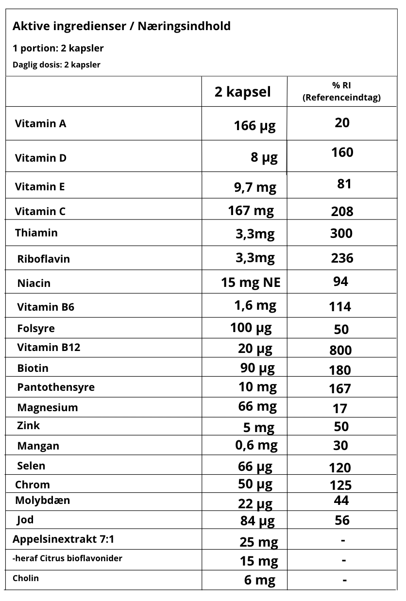Calcium (calciumcitrat), magnesium (magnesiumbisglycinat), stabilisator (dicalciumphosphat), kapsel (hydroxypropylmethylcellulose), vitamin C (calcium-L-ascorbat), kalium (kaliumcitrat), risstivelse, antiklumpningsmiddel (siliciumdioxid), magnesium (magnesiumoxid), appelsinekstrakt 7:1 (Citrus sinensis), E-vitamin (D-alpha-tocopherylacetat), zink (zinkcitrat), niacin (nikotinamid), cholin (cholinhydrogentartrat), selen (L-selenmethionin), pantothensyre (calcium-D-pantothenat), folsyre (calcium-L-methylfolat), vitamin A (beta-caroten), vitamin B1 (tiaminhydrochloride), vitamin B2 (riboflavin), vitamin D (cholecalciferol, vegansk), vitamin B6 (pyridoxal-5’-phosphat), jod (kaliumjodid), mangan (manganocitrat), chrom (chrompicolinat), kobber (cupricitrat), biotin (D-biotin), molybdæn (natriummolybdat) og vitamin B12 (methylcobalamin).