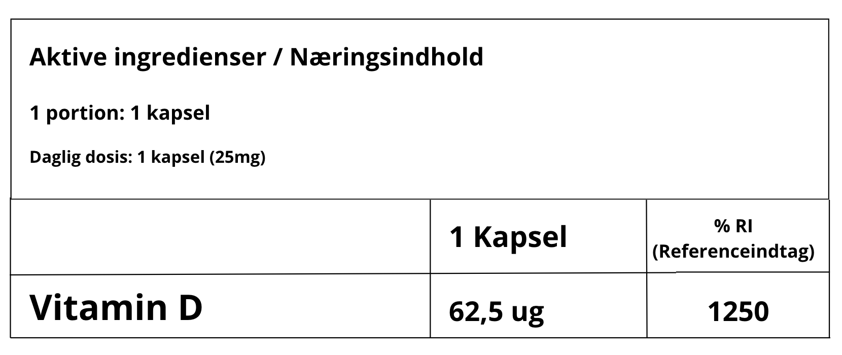 Vitamin D bidrager til immunsystemets normale funktion og hjælper med at vedligeholde normale knogler og muskelfunktion. Derudover spiller vitaminet en rolle i kroppens normale optagelse og udnyttelse af calcium.