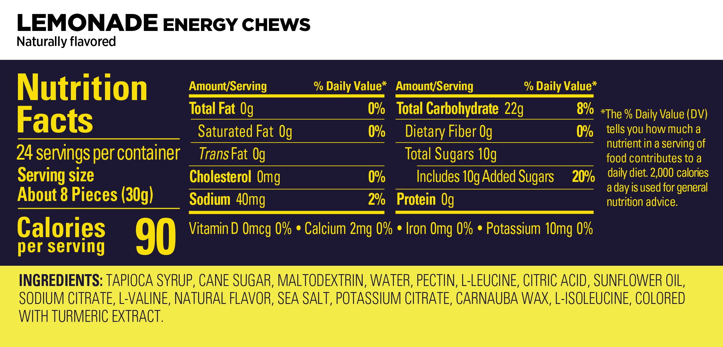 GU Energy's Energy Chews Lemonade er din ideelle træningspartner, der hjælper dig med at nå nye højder i din træning. Med en frisk og forfriskende smag af lemonade, der giver dig den energi, du har brug for, uden at gå på kompromis med smagen, er disse chews det perfekte valg for atleter, der ønsker at maksimere deres præstation. Gør dem til en del af din træningsrutine, og oplev, hvordan de kan hjælpe dig med at bryde grænser – én syrlig bid ad gangen.
