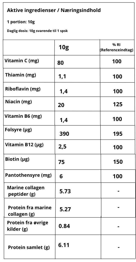 Kollagenet i produktet er hydrolyseret marine kollagen peptider, der stammer fra ASC-certificeret havbrug og er godkendt som et kvalitets- og ansvarligt råvarevalg.