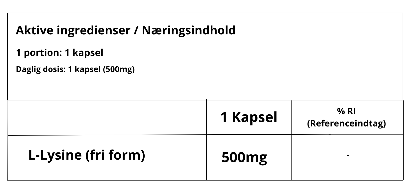 Produktet leveres i en ren og koncentreret form — 500 mg per tablet — og er designet til at støtte det daglige behov for lysin. Derudover er det vegansk, kosher, gluten-, soja-, hvede- og gærfrit, og indeholder ingen mælkeprodukter.