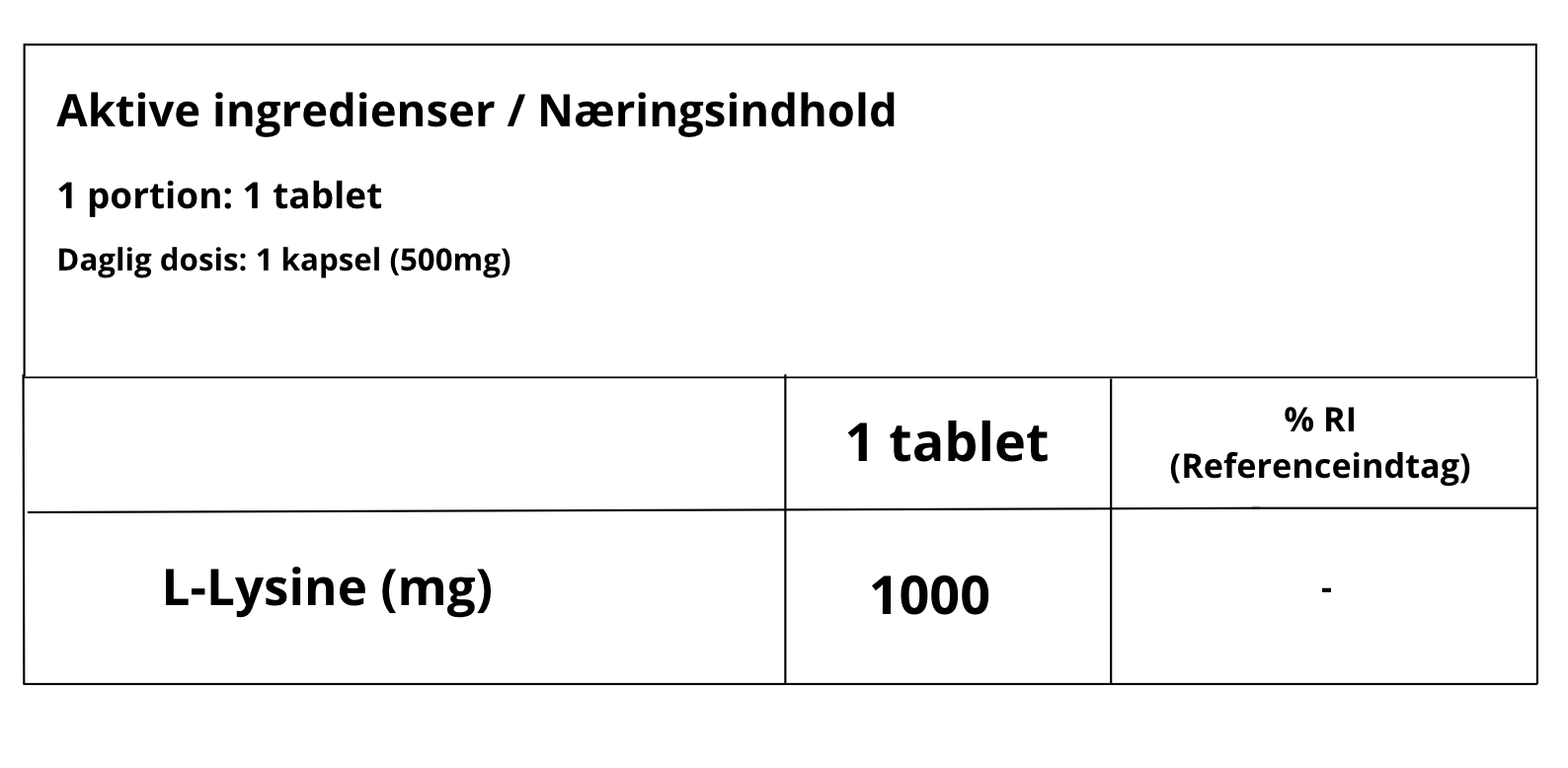 Produktet leveres i en ren og koncentreret form — 1000mg per tablet — og er designet til at støtte det daglige behov for lysin. Derudover er det vegansk, kosher, gluten-, soja-, hvede- og gærfrit, og indeholder ingen mælkeprodukter.