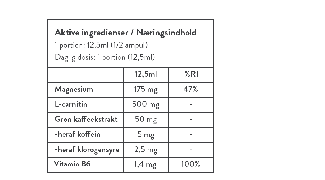 Flydende formel til at reducere muskeltræthed, med magnesium, vitamin B6, L-carnitin og grøn kaffeekstrakt