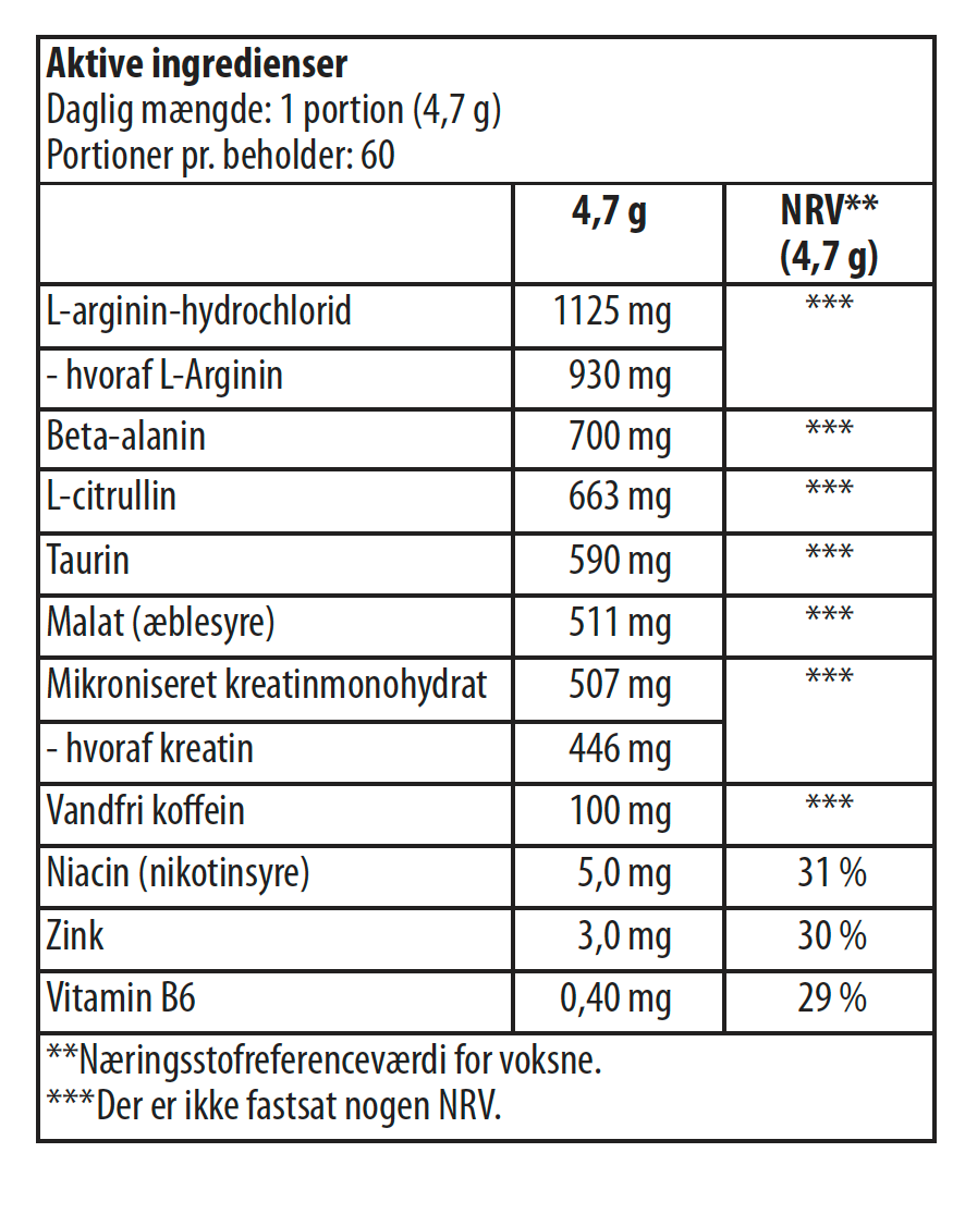 SuperNova indeholder både niacin og Vitamin B6, som reducerer træthed og udmattelse og understøtter en normal energiomsætning. Desuden bidrager Vitamin B6 til normal protein- og glykogenmetabolisme, mens zink hjælper med fedtsyremetabolisme, beskytter cellerne mod oxidativt stress og understøtter din mentale funktion. Med aminosyrer som L-citrullin, L-arginin og beta-alanin samt taurine, der kombineres perfekt med koffein, får du alt, hvad du behøver for at nå dine mål.
